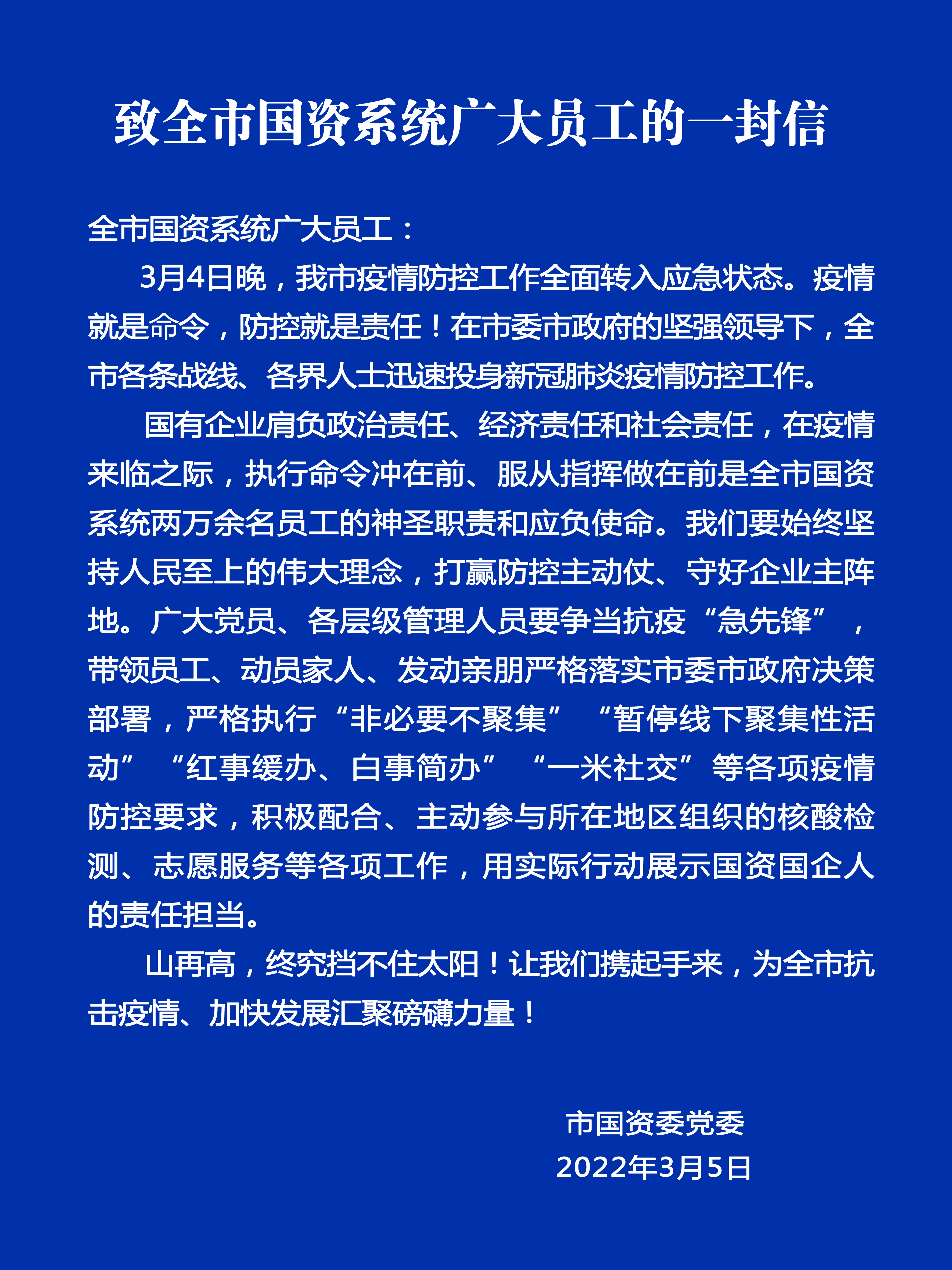 致全市國資系統(tǒng)廣大員工的一封信