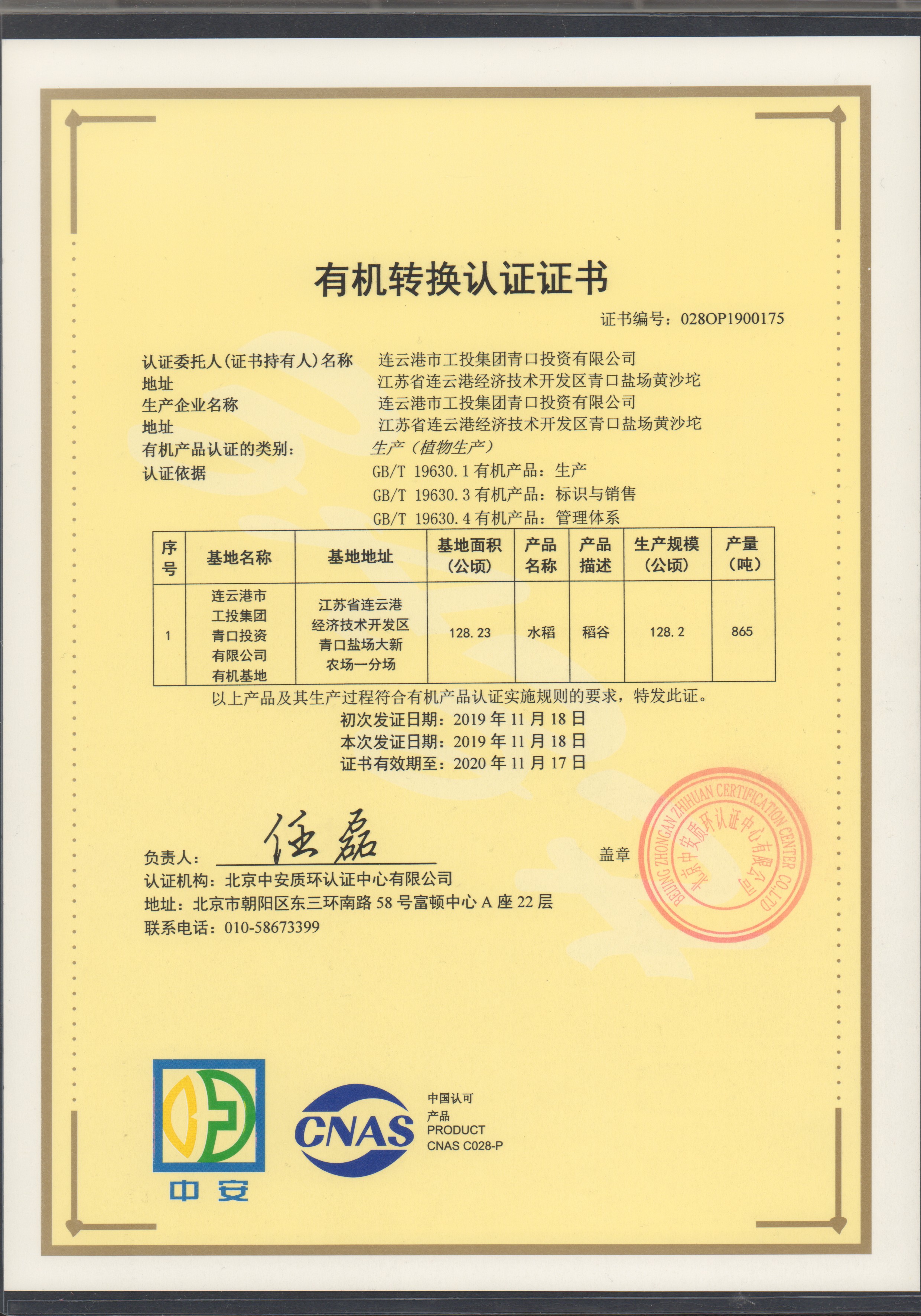 11月25日上午,青口投資公司種植的“南粳9108”有機大米經(jīng)過嚴格的檢測和審核,榮獲北京中安質(zhì)環(huán)認證中心頒發(fā)的有機轉(zhuǎn)換認證證書。