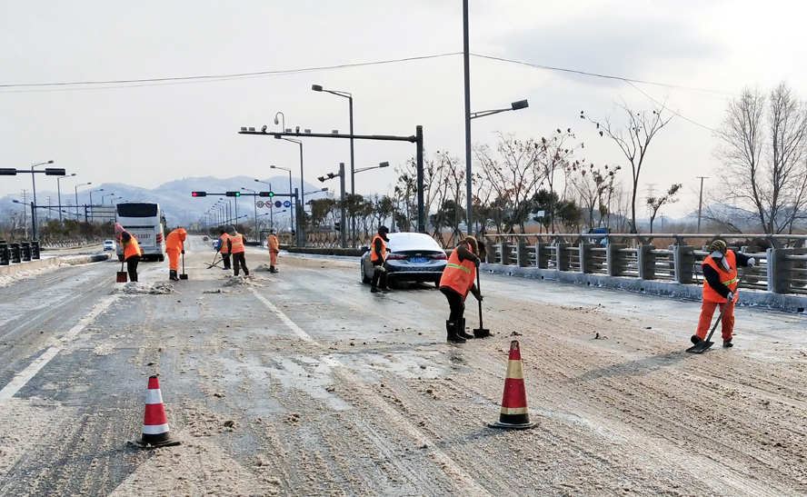裕升、裕欣、裕祥三家養(yǎng)護(hù)公司組織綠化、保潔人員配合除雪車、裝載機(jī)等機(jī)械設(shè)備對(duì)花果山大道、黃海大道、東方大道、242省道、新光路及大浦路等主干道進(jìn)行清雪作業(yè);對(duì)程圩橋、先鋒大橋等橋面易積雪路段以及馬山路立交、新光路涵洞等“上跨下穿”路段采用撒氯化鈣的方式,加速積雪融化,并安排人員及時(shí)掃除積雪,防止路面因低溫降雪產(chǎn)生冰凍,對(duì)交通安全造成影響;對(duì)創(chuàng)智綠園廣場、火車站廣場及匝道等窗口地段采用人機(jī)結(jié)合的形式清掃積雪。盛達(dá)市政公司、瑞泰服務(wù)公司及益豐園林公司在提供鏟車、平板車、裝載機(jī)等機(jī)械車輛配合掃雪的同時(shí),積極做好后勤服務(wù),為清雪工作有序開展提供保障。截至到中午,各條主干道積雪已基本清理完畢,道路恢復(fù)暢通,保障居民出行和交通安全。