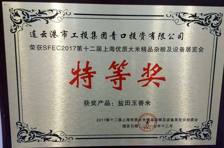 日前,青口投資公司“鹽田玉”大米在2017第十二屆上海優(yōu)質(zhì)大米及精品雜糧展覽會上榮獲特等獎,這是繼“江蘇好大米”稱號之后的又一重大殊榮。