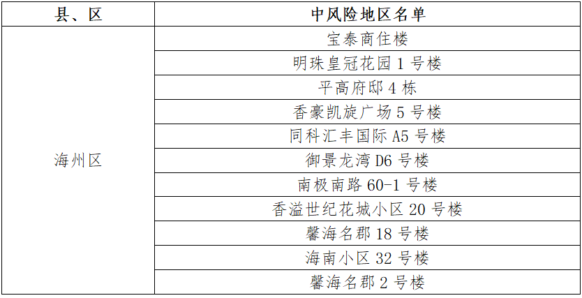 根據(jù)國(guó)務(wù)院聯(lián)防聯(lián)控機(jī)制有關(guān)規(guī)定,經(jīng)市指揮部研究決定,自發(fā)布之日起,對(duì)我市部分區(qū)域疫情風(fēng)險(xiǎn)等級(jí)進(jìn)行調(diào)整:海州區(qū)同科匯豐國(guó)際C10號(hào)樓、紫金公館3號(hào)樓、興業(yè)時(shí)代花園B6號(hào)樓、興業(yè)時(shí)代花園C6號(hào)樓、九龍城市樂(lè)園77號(hào)樓、明珠皇冠花園20號(hào)樓、華潤(rùn)公寓、雙龍村澗西隊(duì)65號(hào)、眾興華庭10號(hào)樓、壹品國(guó)際C區(qū)、香溢世紀(jì)花城小區(qū)2號(hào)樓、明珠皇冠花園11號(hào)樓、小學(xué)路11-1號(hào)樓、兆隆城市洋房A號(hào)樓、振興小區(qū)2號(hào)樓、易居公館4號(hào)樓、浦潤(rùn)花園4號(hào)樓由中風(fēng)險(xiǎn)地區(qū)調(diào)整為低風(fēng)險(xiǎn)地區(qū)。其他地區(qū)風(fēng)險(xiǎn)等級(jí)不變。調(diào)整后全市現(xiàn)有11個(gè)中風(fēng)險(xiǎn)地區(qū)。