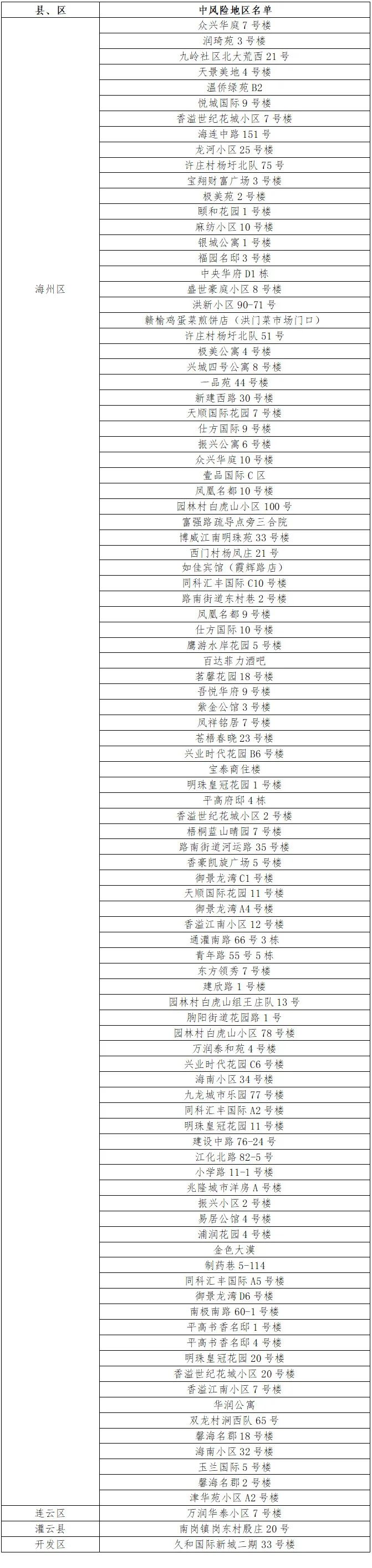 根據(jù)國務(wù)院聯(lián)防聯(lián)控機(jī)制有關(guān)規(guī)定,經(jīng)綜合評估研判,市指揮部決定,自發(fā)布之日起,將海州區(qū)明珠皇冠花園20號樓、香溢世紀(jì)花城小區(qū)20號樓、香溢江南小區(qū)7號樓、華潤公寓、雙龍村澗西隊(duì)65號、馨海名郡18號樓、海南小區(qū)32號樓、玉蘭國際5號樓、馨海名郡2號樓、津華苑小區(qū)A2號樓調(diào)整為中風(fēng)險地區(qū)。 其他地區(qū)風(fēng)險等級不變。調(diào)整后全市現(xiàn)有99個中風(fēng)險地區(qū)。 連云港市突發(fā)新冠肺炎疫情 應(yīng)急處置指揮部辦公室 2022年3月14日 連云港市中風(fēng)險地區(qū)(99個) (2022年3月14日)