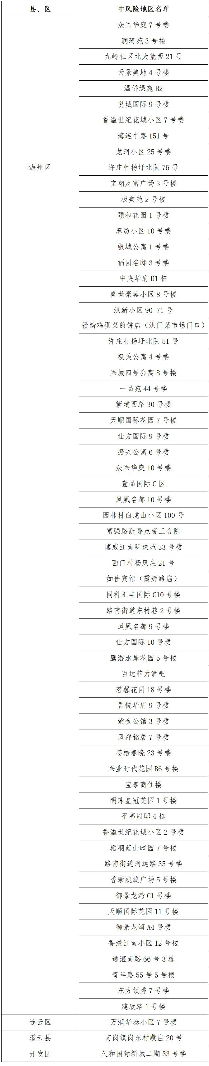 根據(jù)國務(wù)院聯(lián)防聯(lián)控機(jī)制有關(guān)規(guī)定,經(jīng)綜合評估研判,市指揮部決定,自發(fā)布之日起,將海州區(qū)茗馨花園18號樓、吾悅?cè)A府9號樓、紫金公館3號樓、鳳祥銘居7號樓、蒼梧春曉23號樓、興業(yè)時代花園B6號樓、寶泰商住樓、明珠皇冠花園1號樓、平高府邸4棟、香溢世紀(jì)花城小區(qū)2號樓、梧桐藍(lán)山晴園7號樓、路南街道河運路35號樓、香豪凱旋廣場5號樓、御景龍灣C1號樓、天順國際花園11號樓、御景龍灣A4號樓、香溢江南小區(qū)12號樓、通灌南路66號3棟、青年路55號5號樓、東方領(lǐng)秀7號樓、建欣路1號樓調(diào)整為中風(fēng)險地區(qū)。其他地區(qū)風(fēng)險等級不變。調(diào)整后全市現(xiàn)有66個中風(fēng)險地區(qū)。
