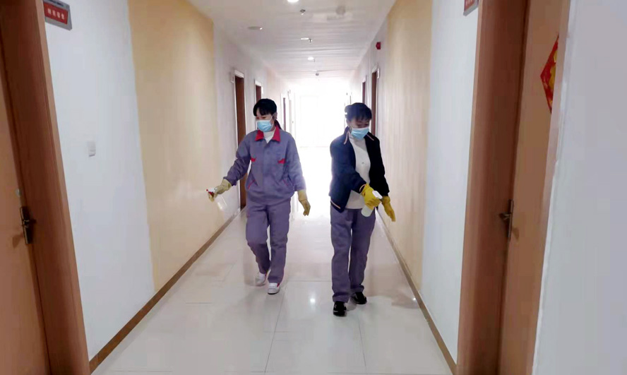 干凈整潔的辦公樓、宿舍樓里飄著淡淡的消毒水味道,清瘦干練的保潔員任禮勤正在仔細(xì)地打掃著樓道。5號疫情突發(fā)之時她正好當(dāng)班,根據(jù)以往疫情經(jīng)驗(yàn),她果斷地把一直照料著的年邁母親安排給了大哥,此后便堅(jiān)守在工作崗位上。疫情防控期間的工作量增加了不少,每天她和同事們分片作業(yè),在認(rèn)真做好各自清潔區(qū)每日兩次的保潔、消毒工作的同時,還要負(fù)責(zé)就餐人員一日三餐的登記、測量體溫等工作。每天從早上7點(diǎn)開始,5位保潔員的身影便忙碌在公司的門廳、餐廳、樓道、電梯等場所,這一忙常常要到晚上6點(diǎn)多。“請您量下體溫”“今天你做核檢了嗎”,這些溫馨的話語幾乎成了她們對大家的問候語。
