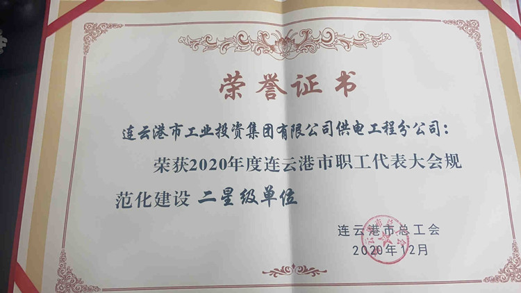 近日,供電公司榮獲市總工會頒布的2020年度連云港市職工代表大會規(guī)范化建設(shè)二星級單位。