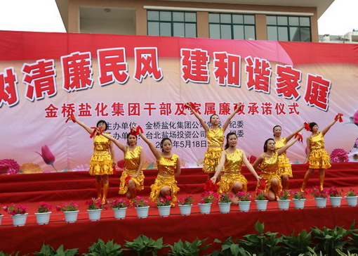 5月18日下午,集團公司在臺北鹽場投資公司舉行黨員干部及家屬“樹清廉民風(fēng),建和諧家庭”廉政承諾儀式,并進行了贈書儀式和豐富多彩的文藝演出。在文藝演出中,我公司職工自編自演的快板《廉政準(zhǔn)則送清風(fēng)》、女聲獨唱《守住清廉》、合作節(jié)目詩朗誦《清廉暢想》受到了觀看演出的各級領(lǐng)導(dǎo)和職工群眾的一致好評。(司宣 司紀(jì))