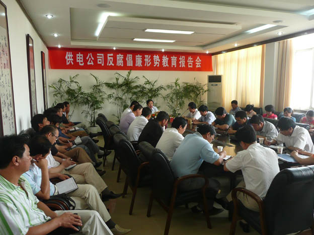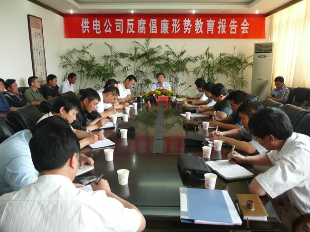 近日,我公司邀請了市紀(jì)委常委、市紀(jì)委秘書長、市監(jiān)察局副局長雷生保同志來我公司作反腐倡廉形勢教育報告,公司領(lǐng)導(dǎo)、機(jī)關(guān)中層干部、各供電所領(lǐng)導(dǎo)班子及部分職工代表參加了會議。