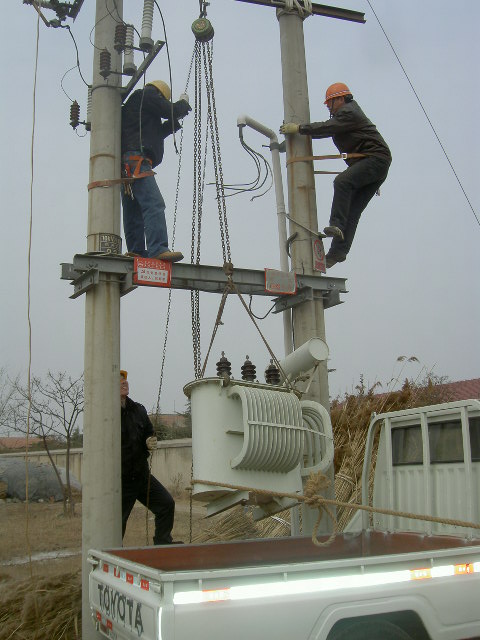 春節(jié)前夕,徐圩供電所加大電力設備和線路巡視維護力度,將預防大面積停電事故作為節(jié)前安全生產的首要任務。該所認真組織人員深入轄區(qū)查找線路和設備存在的安全隱患,提前作好安排和準備,2月5日發(fā)現(xiàn)辛高圩地區(qū)99#變壓器節(jié)日期間容量可能不夠,便及時調換了變壓器,確保用電安全。(圖為該所職工在調換變壓器)(馬德松)