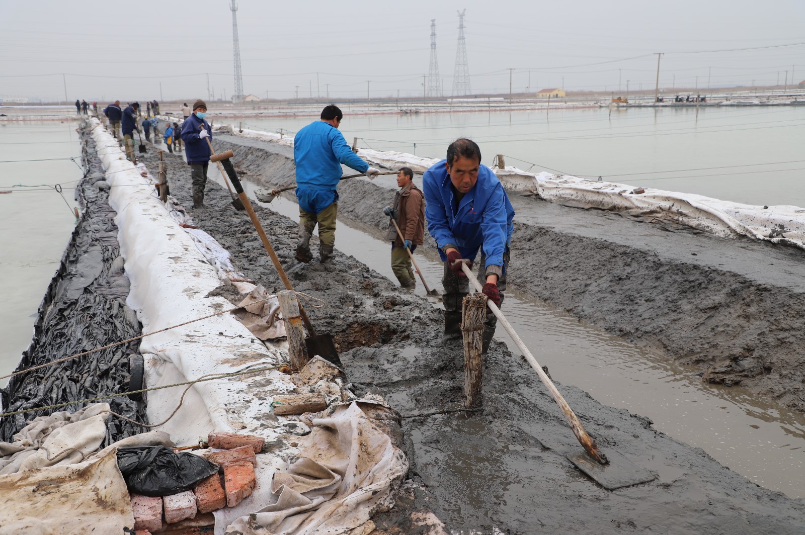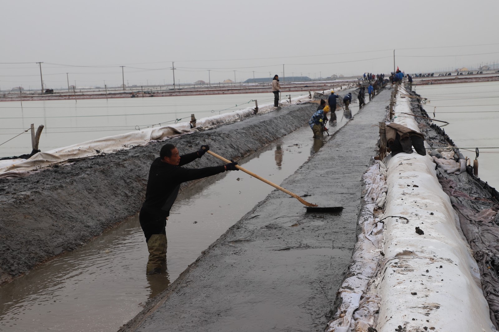 在新河制鹽分公司鹽田地頭的冬準(zhǔn)會戰(zhàn)現(xiàn)場,人頭攢動(dòng),工人們正動(dòng)作嫻熟的進(jìn)行澆水、翻泥、踩實(shí)、做埝、整平……,鹽工們?nèi)幭冗M(jìn)位,手腳不停的揮鍬挖泥,呈現(xiàn)出你追我趕、比肩發(fā)力的勞動(dòng)場景。一條條溝道改造、格堰修整等亮化灘場文明建設(shè)煥然一新,一幅幅“人勤春早”的美麗畫卷徐徐展開。