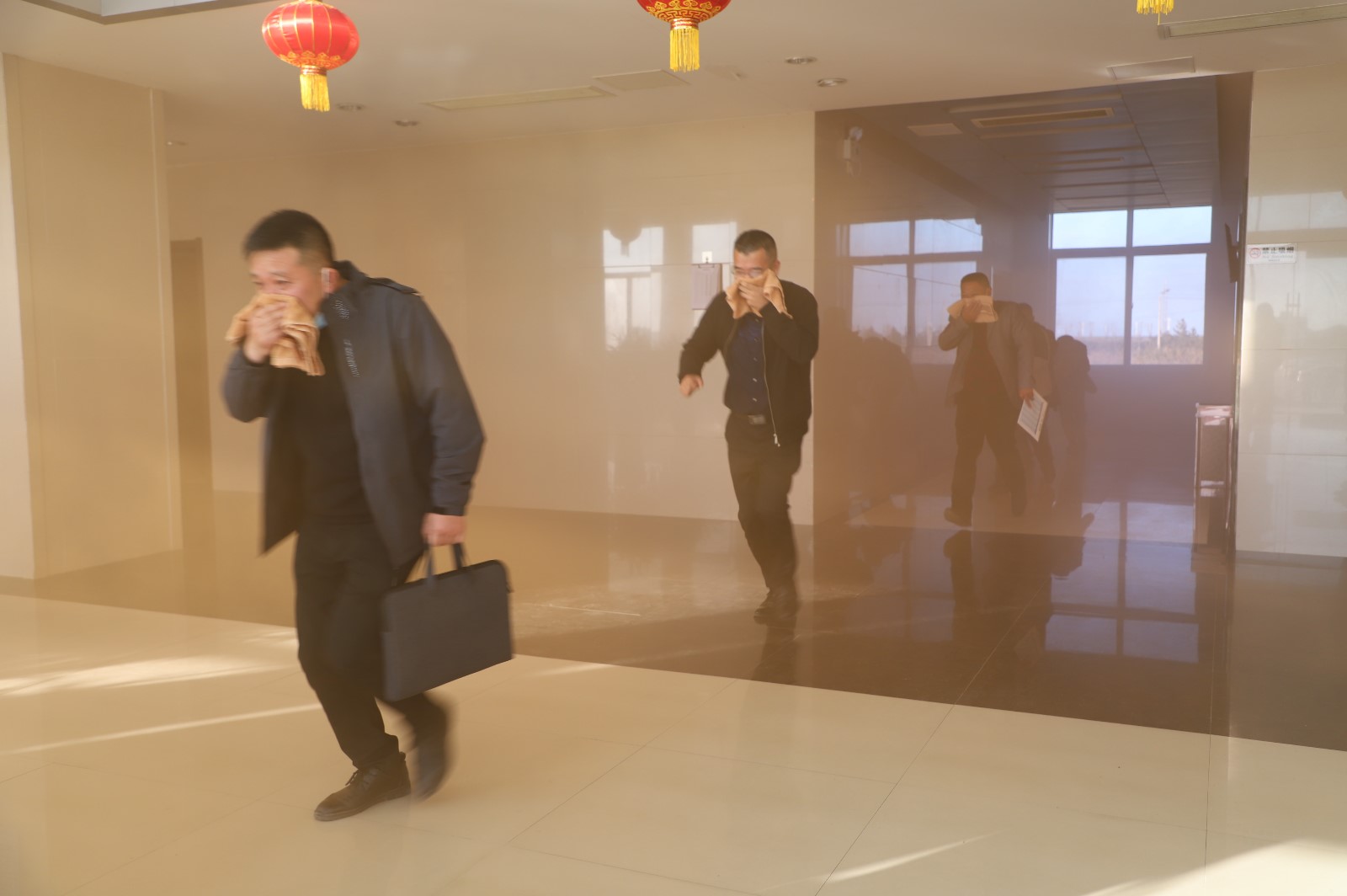 此次實戰(zhàn)演練的“突發(fā)事件”地點設(shè)在機(jī)關(guān)大樓,所有參訓(xùn)人員按照既定的消防應(yīng)急預(yù)案進(jìn)行了一次消防安全模擬演練。隨著“消防警報聲”響起,正在大樓內(nèi)工作的員工在濃煙中用濕巾捂嘴、彎腰、靠墻從樓梯道口迅速有序地疏散、撤離,在假定火災(zāi)發(fā)生條件下進(jìn)行逃生自救實戰(zhàn)演練。救援組、疏散組、后勤組各組成員各負(fù)其職,配合有序,隨后,大家在樓前廣場上進(jìn)行了滅火器實戰(zhàn)操作訓(xùn)練。
