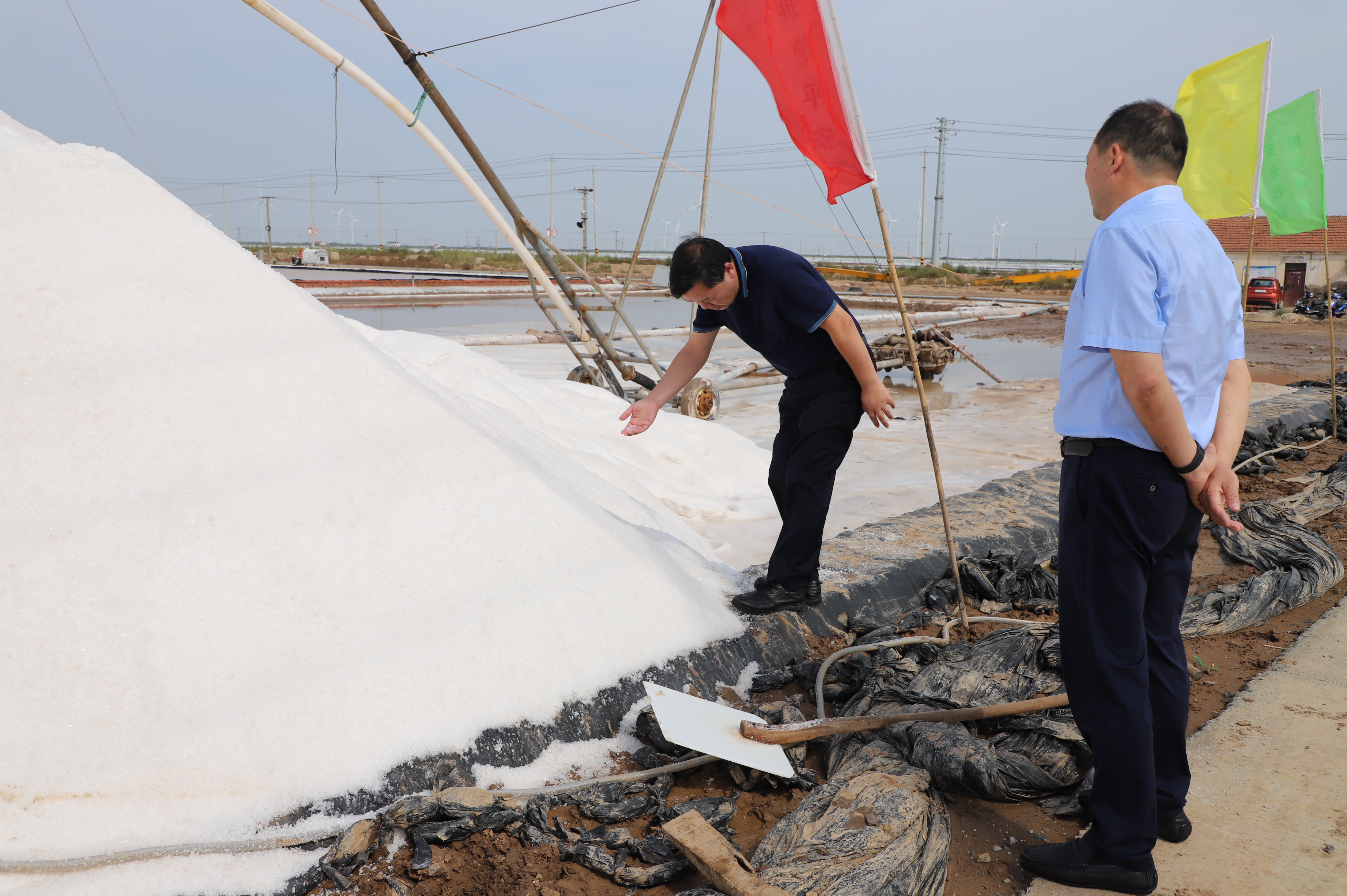 調(diào)研組一行先到新河十三班參觀現(xiàn)場扒鹽,李國文董事長向調(diào)研組一行介紹了目前日曬制鹽公司采用的帶鹵扒鹽技術(shù),并就目前鹽業(yè)生產(chǎn)、運輸、銷售等情況進行了簡單的介紹。