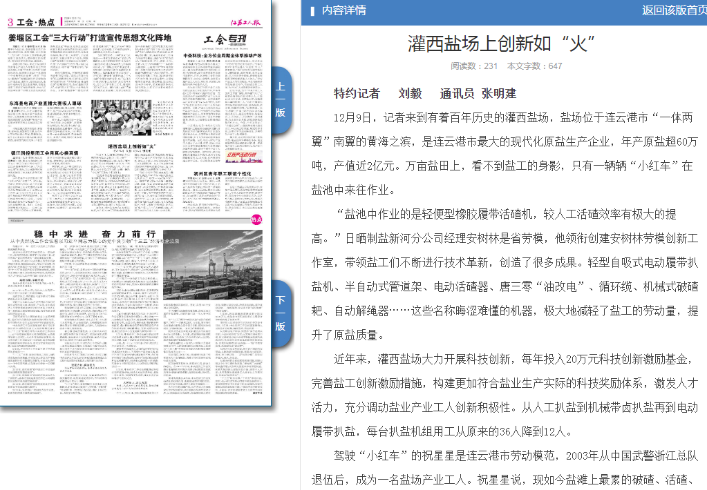 駕駛“小紅車(chē)”的祝星星是連云港市勞動(dòng)模范,2003年從中國(guó)武警浙江總隊(duì)退伍后,成為一名鹽場(chǎng)產(chǎn)業(yè)工人。祝星星說(shuō),現(xiàn)如今鹽灘上最累的破碴、活碴、扒鹽、收放塑布都是機(jī)械化操作,高強(qiáng)度制鹽工作都被機(jī)械取代,極大地減輕鹽工勞動(dòng)負(fù)荷。剛到鹽場(chǎng)工作時(shí),祝星星跟著師傅王新東學(xué)習(xí)制鹽工藝,長(zhǎng)年累月地風(fēng)吹日曬,祝星星早已沒(méi)有當(dāng)年的白凈膚色,收獲的是成熟的工作經(jīng)驗(yàn),成長(zhǎng)為制鹽技術(shù)“大拿”,創(chuàng)新“傳統(tǒng)海鹽+新式工藝”生產(chǎn)模式、“216”式單池加鹵法,實(shí)現(xiàn)了鹽業(yè)生產(chǎn)技藝上的一次次變革。(特約記者 劉毅 通訊員 張明建)