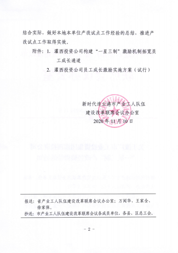 11月20日,新時(shí)代連云港市產(chǎn)業(yè)工人隊(duì)伍建設(shè)改革聯(lián)席會(huì)議辦公室在全市推廣工投集團(tuán)灌西投資公司“一星三制”產(chǎn)改經(jīng)驗(yàn)。