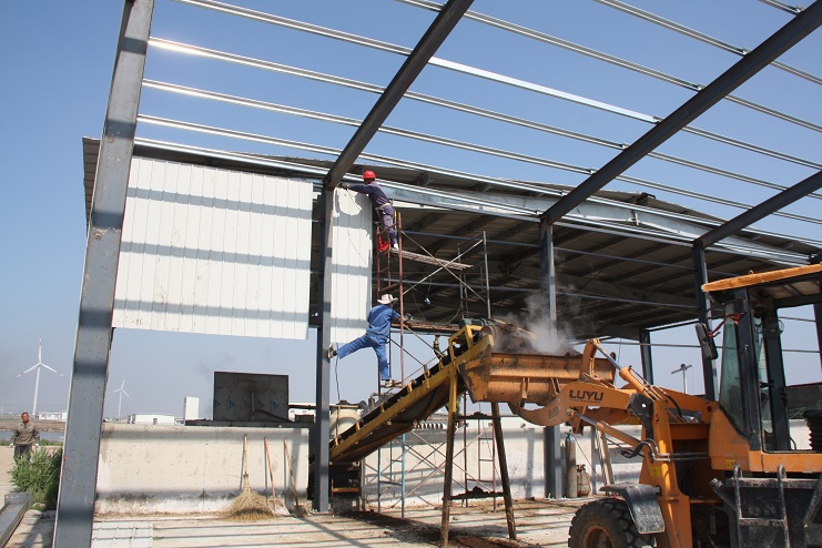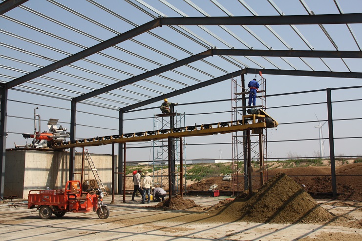 5月18日,位于北北歐農(nóng)莊生豬養(yǎng)殖廠旁邊的綠淮肥業(yè)公司有機(jī)肥生產(chǎn)基地,一個(gè)鋼結(jié)構(gòu)廠房即將完工,只見機(jī)聲轟鳴、焊花飛濺,機(jī)電服務(wù)公司的工人在勞模王緒華帶領(lǐng)下正在焊接鋼結(jié)構(gòu)件,而正在建設(shè)施工中的廠房?jī)?nèi),兩條有機(jī)肥生產(chǎn)線運(yùn)轉(zhuǎn)不停,沒有因廠房建設(shè)而停產(chǎn),廠房旁邊的一臺(tái)挖掘機(jī)正在整平場(chǎng)地,一邊建設(shè),不邊生產(chǎn),一派紅火景象。