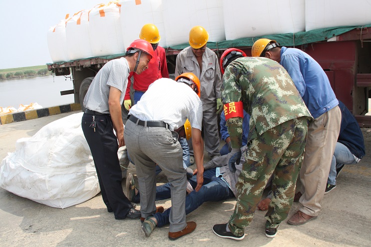在這次的安全演練中,投資公司運營監(jiān)管部部長李長軍主持了這次的安全演練活動,宵洋物流公司碼頭當(dāng)班作業(yè)人員參與演練。在五灌河碼頭,正在吊裝的噸袋脫落,砸在一名操作人員的腿上,安全員王緒銀立即指揮停止作業(yè),作業(yè)現(xiàn)場安全負責(zé)人陸應(yīng)兵立即現(xiàn)場指揮人員現(xiàn)場施救,查看傷情,撥打120急救電話,同時向單位負責(zé)人沈志兵匯報。沈志兵及時趕到現(xiàn)場啟動應(yīng)急預(yù)案,疏散場地車輛,讓出120進場通道,命令救援小組展開緊急救援,并向公司運營監(jiān)管部和領(lǐng)導(dǎo)報告。在救援中,大家各司其職,齊心協(xié)力,配合默契,有條不紊成功完成了此次演練活動。通過這次應(yīng)急演練;進一步提高了公司員工在發(fā)生安全傷害事故時的現(xiàn)場處置能力和自救能力。