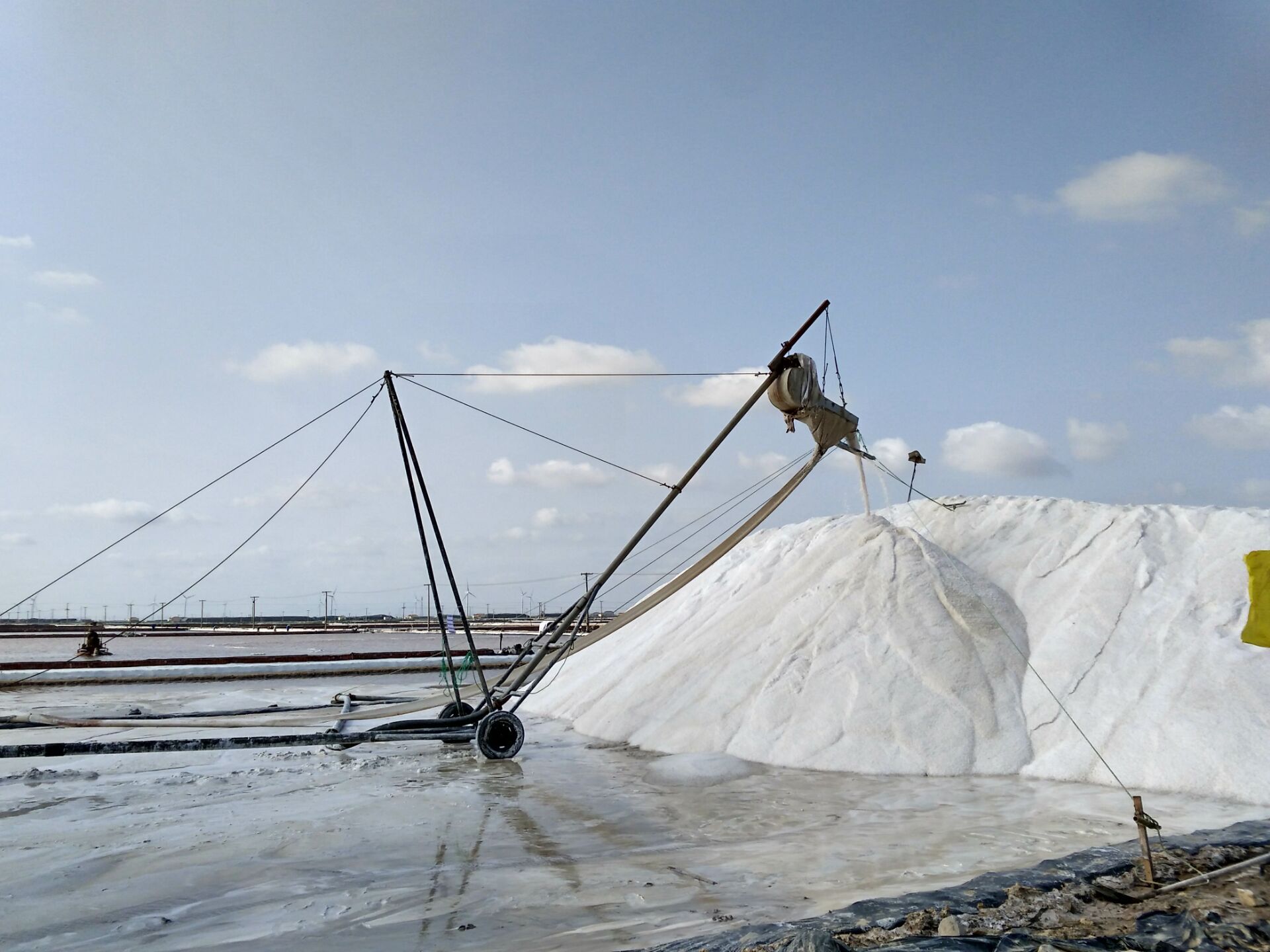 10月6日,在日曬制鹽新河分公司十班,幾名鹽工在不遠(yuǎn)處鹽池內(nèi)整理扒過(guò)鹽的格塊,一臺(tái)唐三零機(jī)械正在最后一塊鹽池內(nèi)緩緩移動(dòng)集鹽,鹽泵運(yùn)轉(zhuǎn)不停,輸送鹽上廩,一條鹽廩即將筑成。在國(guó)慶假日期間,日曬制鹽公司值班人員不脫崗、生產(chǎn)經(jīng)營(yíng)不斷線(xiàn)、鹽業(yè)生產(chǎn)不停歇,入秋以來(lái),已扒鹽5萬(wàn)噸,為公司的國(guó)慶假日增添了道道靚麗的風(fēng)景。