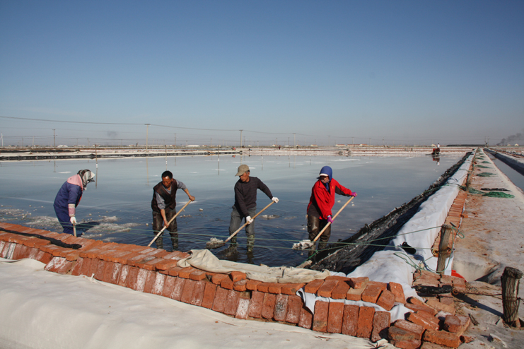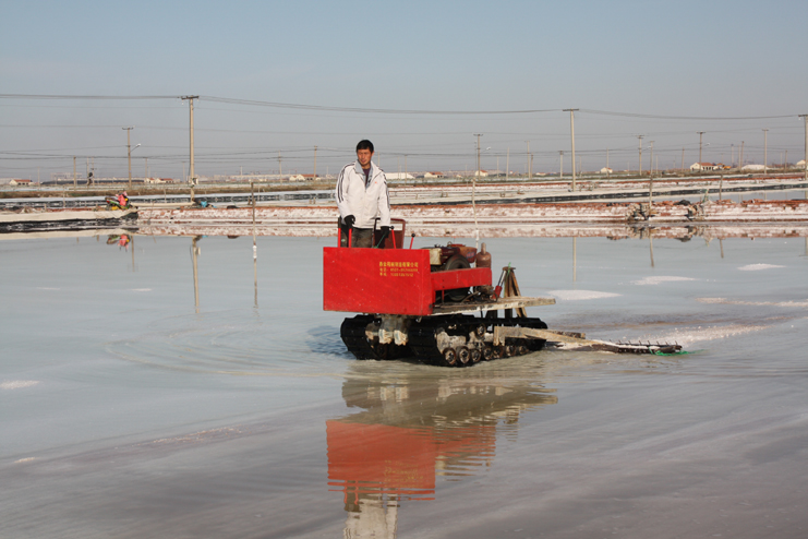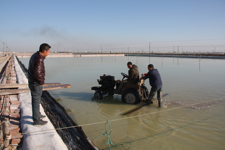 在埒南制鹽分公司的八班,我們看到一名工人正熟練操作著一臺整平機械在結晶池內來回移動,對扒過鹽的格塊進行整平,還有幾名工人用鐵锨整平機械到不了的邊角地帶。由于在廩基上沒有看到鹽,而結晶池已扒過鹽,我們覺得奇怪,經了解,原來今年新扒鹽已經有部分銷售了出去。埒南制鹽分公司經理楊守兵正在九班的灘上查看機械破碴情況,他說道:“我們以委員包片形式深入班組貫徹公司職代會精神,加強形勢任務宣傳統(tǒng)一思想,讓員工認識到當前原鹽市場回暖行情,鼓舞士氣,振奮精神,全力投入到當前春季生產中來。”