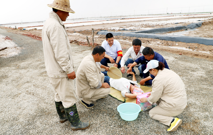 此次演練過程中,安全監(jiān)管部李長軍主持了這次演練活動,埒南制鹽分公司職工及管理人員參與其中,演練模擬現(xiàn)場有三個:1、職工在灘頭塑池堰上突然中暑(重度)。2、職工在廩基小鹽化鹵調(diào)鹵中接觸老化線路接頭時不慎觸電(傷害較重)。3、職工在上班途中三輛電瓶車相撞(跌傷較重)。在救援過程中,大家各司其職,齊心協(xié)力,配合默契,有條不紊成功完成了此次演練活動。通過這次應(yīng)急演練,進一步提高了公司員工應(yīng)對緊急事件的自我保護和防衛(wèi)能力,保證員工在發(fā)生突發(fā)事件時,能熟練應(yīng)對、有序救援,最大限度地減少事故帶來的損害,切實保護員工的安全。