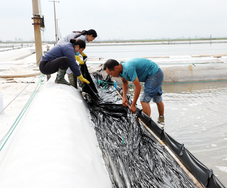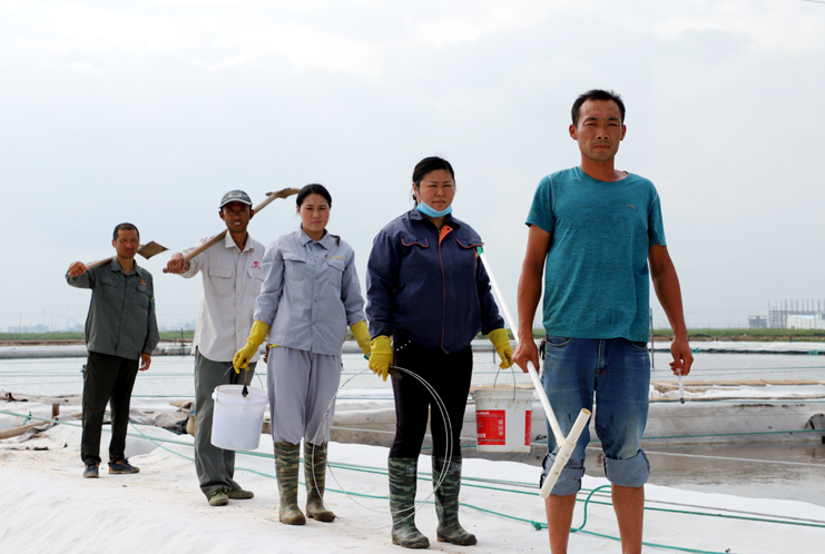 8月15日早,在制鹵區(qū)2班,班長王春好帶著班組的工人準備干活,安排好每個人的工作后,大家拿起工具上灘,工人們分散開來,各自忙著手里的活。工人們前后排開,彎腰俯身,用鐵鍬挖溝做堰,為下雨排淡水做好準備。“踩在鹵水里能感覺像是在“燙腳”,太陽把鹵水曬的滾燙的。”領灘手王春好用衣袖擦著臉上的汗水說,自己在灘上干了有七、八年了,對于這樣的工作環(huán)境已經適應了。進入八月以來,連續(xù)7天最高溫度達到35以上,臺風過后,今天的氣溫也達到了33度,令今年這個夏天,成為有完整氣象記錄最熱的夏天。跑水工仇海濱,到灘上一個多小時,以是大汗淋漓,他帶領工人做一些修堰、補塑布、緊繩、還有查跑道頭的活。