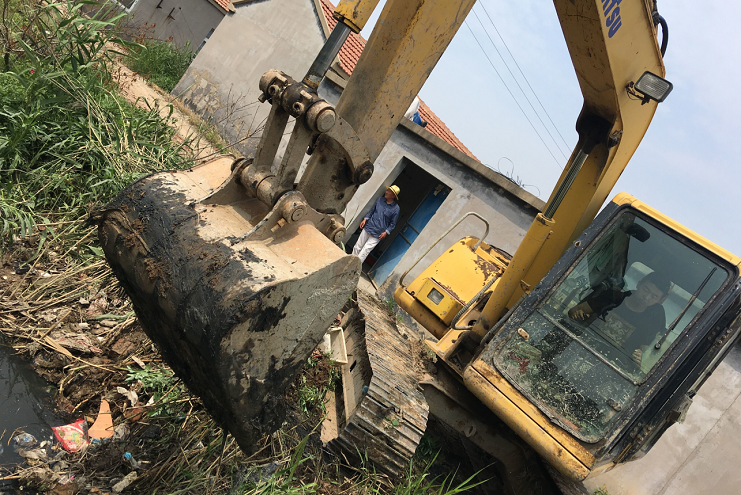 "各項(xiàng)防汛工作中,當(dāng)數(shù)中二圩排水道堵塞問題最為突出,由于之前的燕尾港鎮(zhèn)拆遷,大量拆遷戶涌入灌西鹽場中二圩地區(qū)生活,違建現(xiàn)象嚴(yán)重,各種建筑垃圾和白色垃圾隨處堆放,排水系統(tǒng)深受其害。為方便職工群眾生活起居,灌西公司對中二圩地區(qū)排水道進(jìn)行疏通清理,以便安度汛期。”清理現(xiàn)場,," 防汛辦公室主任楊善兵說道,只見大小挖機(jī)全力施工,對于大挖機(jī)不好進(jìn)入的居民區(qū)內(nèi)部小溝小道則由小挖機(jī)專門清理,對于復(fù)雜地形機(jī)械難以進(jìn)入的地方只能人工清理,務(wù)求做到全面徹底,不留死角。