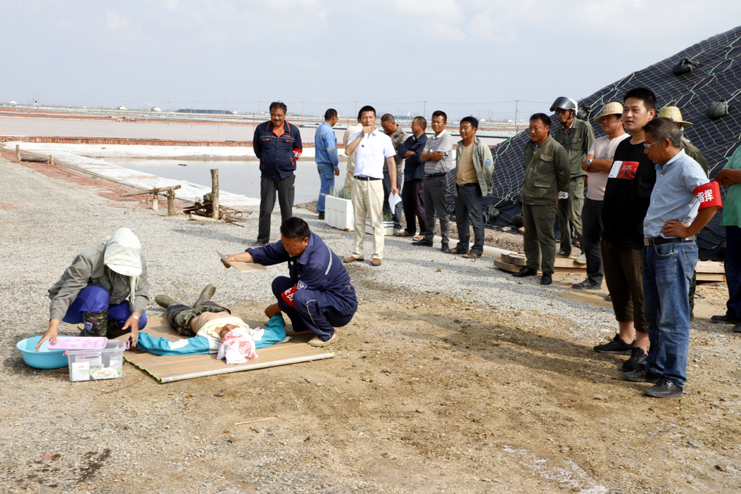 當(dāng)天下午正直高溫天氣,室外環(huán)境悶熱?,F(xiàn)場(chǎng),鹽工孫良成在烈日下工作幾個(gè)小時(shí)后早已汗流浹背,堅(jiān)持工作一段時(shí)間后,感到頭暈?zāi)垦?,支持不住倒在了鹽池邊上?,F(xiàn)場(chǎng)安全員張軍連第一時(shí)間趕到現(xiàn)場(chǎng),根據(jù)經(jīng)驗(yàn),初步判斷倒地者出現(xiàn)了中暑癥狀。立即組織員工董志波和曹軍華將孫良成抬至陰涼通風(fēng)處,側(cè)臥后仰頭部,保持其呼吸暢通。并解開他身上的衣扣,一邊為他扇風(fēng)送涼。大伙一邊用溫濕毛巾不斷為他擦拭身體降溫,一邊喂他服下藿香正氣水,并用清涼油、風(fēng)油精等擦拭額頭位置。在現(xiàn)場(chǎng)急救迅速開展的同時(shí),班長(zhǎng)林樹軍立即向埒南分公司安全負(fù)責(zé)人江躍匯報(bào),江躍到達(dá)現(xiàn)場(chǎng)了解情況并通知公司經(jīng)理?xiàng)钍乇?,同時(shí)通知120急救中心,幾分鐘后,120急救人員趕到現(xiàn)場(chǎng),并對(duì)中暑人員進(jìn)行施救,經(jīng)過(guò)緊張有序的急救,患者逐漸蘇醒并初步恢復(fù)神智,抬上救護(hù)車送去醫(yī)院,至此演練結(jié)束。