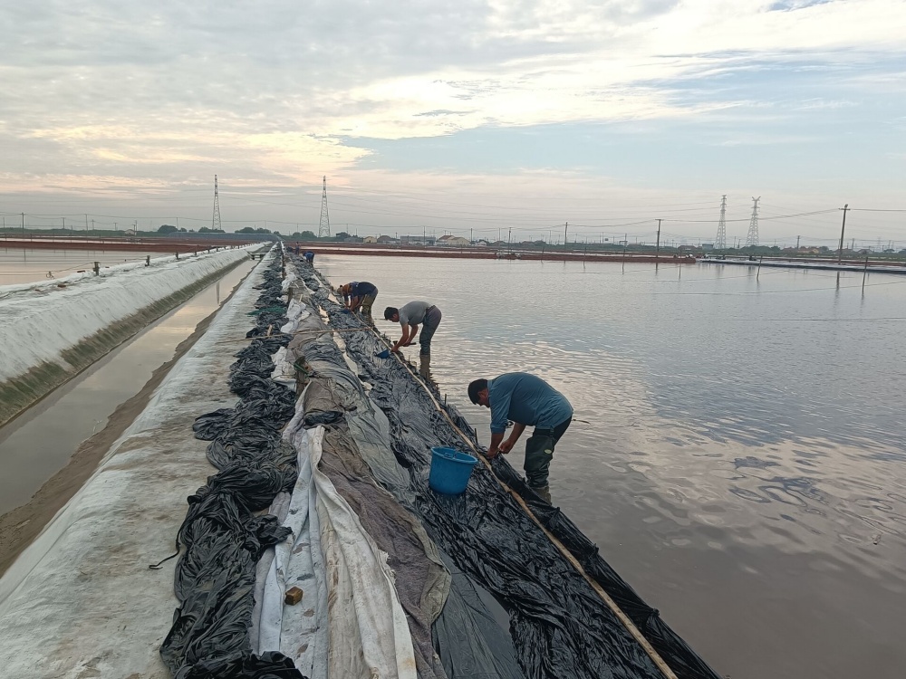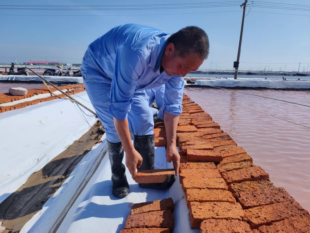鏖戰(zhàn)酷暑,保目標(biāo)。當(dāng)前,正是原鹽生產(chǎn)的關(guān)鍵時期,面對高溫酷暑的嚴(yán)重考驗,該公司干部職工迎難而上,戰(zhàn)高溫斗酷暑、搶晴天保生產(chǎn),全力投入到高溫生產(chǎn)、保鹽保鹵等工作中,及時修補(bǔ)塑布,加強(qiáng)塑布收放系統(tǒng)維護(hù)保養(yǎng),隨時做好拉塑布準(zhǔn)備工作;管理人員以上率下,實施24小時現(xiàn)場值班機(jī)制,強(qiáng)化除硫制鹽工藝,抓實抓細(xì)原料鹵水、結(jié)晶池等源頭過程管控,確保全年產(chǎn)鹽60萬噸。驕陽烈日下,萬畝銀灘鹵水潺潺、“五彩斑斕”,產(chǎn)業(yè)工人在39℃高溫的戶外勞作,在熱氣蒸人的鹵水鹽田里,揮汗如雨,構(gòu)成了一幅最美的“鹵上芭蕾”。(許東彥)