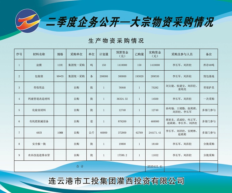 1、由集團公司集中采購塑料布(鹽膜)150噸(由工投集團運營監(jiān)管部在總部組織招標)、包裝袋20萬條,實購金額計169.953萬元。