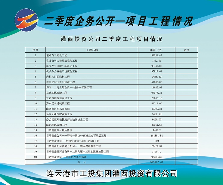 道路石子鋪設工程98858.47元;實業(yè)公司大樓外墻除險工程7372.91元;機關辦公樓廣場綠化工程98447.00元;機關辦公室樓廣場旗臺工程95919.64元;老機關門面涂料工程3658.50元;埒南泵站引水河疏浚工程57200.00元;埒南、二灣 土地改良—進排水管涵工程14645.93元;扶貧基地改造工程98076.31元;扶貧幫困基地零星工程29200.12元;海水送水道疏浚工程47712.00元;灌西菜市場瓦面修理46709.31元;場內公路保護設施工程5402.98元;辦公樓室外樓梯底部洼地回填土工程9460元;筑包場地大棚工程36361.67元;日曬制鹽辦公場所修理4462.2元;日曬制鹽公司---埒南一期14—15班土夾石墊層工程181881.84元;日曬制鹽公司---新河分公司一班危房修理工程900元;日曬制鹽公司新河分公司—一期水泥路整修工程 28428.51元;日曬制鹽新河分公司一二期九至十三班水泥路整修工程37401.7元;日曬制鹽公司---值班房及機房修理93788.39元