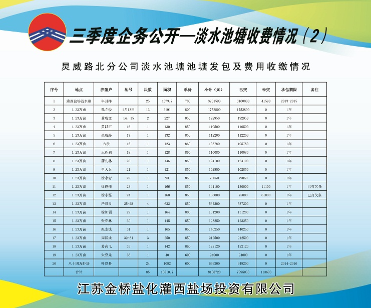 (二)淡水養(yǎng)殖池塘發(fā)包及費(fèi)用收繳情況:共發(fā)包淡水養(yǎng)殖池塘210塊,面積21574.14畝,應(yīng)收租賃費(fèi)1420.5612萬元,已收租賃費(fèi)1170.2558萬元,欠收租賃費(fèi)250.3054萬元,收繳率為82.38%,正在加緊催收中。