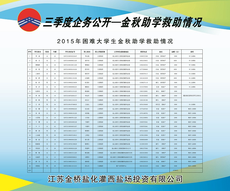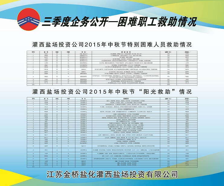 三季度,公司黨委積極做好走訪慰問、送溫曖工作,灌西鹽場(chǎng)投資公司、日曬制鹽公司對(duì)30名困職工發(fā)放陽光救助金30000元;對(duì)15名患重大疾病困職工及直系親屬發(fā)放救助金15000元;對(duì)26名困難大學(xué)生實(shí)行金秋助學(xué)金67000元。具體情況請(qǐng)查看公示展板。