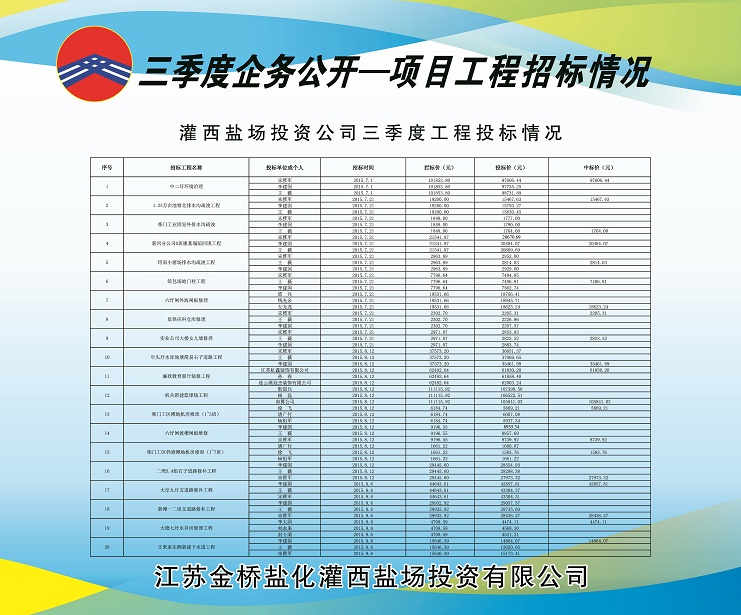 三季度灌西共開工建設(shè)20個(gè)工程項(xiàng)目,分4次由投資公司招標(biāo)領(lǐng)導(dǎo)小組采用公開邀標(biāo)形式進(jìn)行了招標(biāo)。