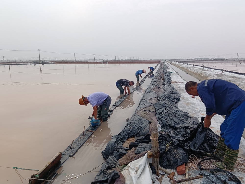 新河制鹽分公司統(tǒng)一安排和調(diào)配,利用夏季短晴天期間、打時間差的方式,對各班組塑布進行更換更新。班組人員有的加固浮板,有的釘釘子,有的拆裝鐵釘,有的制作擋浪布小站樁。乒乒乓乓的敲打聲不絕于耳,一派忙碌景象,為確保原鹽生產(chǎn)能安全度過雨季打下堅實基礎(chǔ)。(新河黨支部)