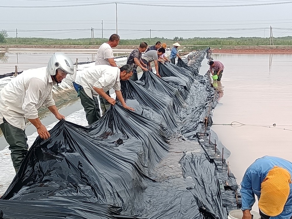 隨著主汛期到來,由于各班組部分塑布已達使用年限,老化嚴(yán)重,且容易造成鹵水跑漏現(xiàn)象發(fā)生,為了減少鹵水損耗,7月10日,新河制鹽分公司黨支部組織黨員突擊隊到班組對到期塑布進行更換。