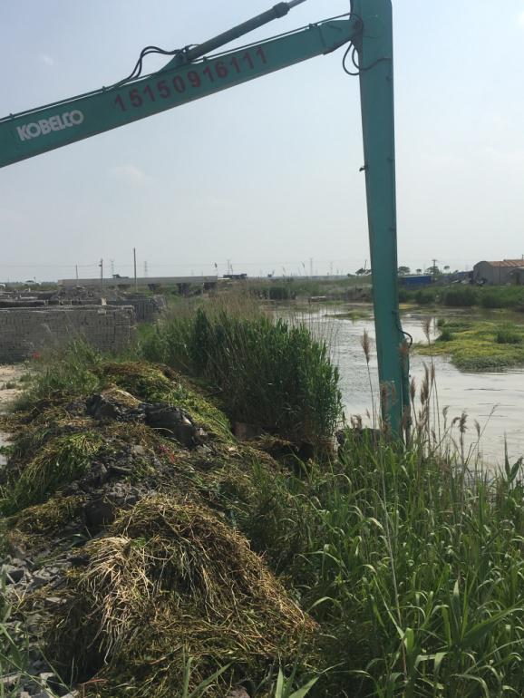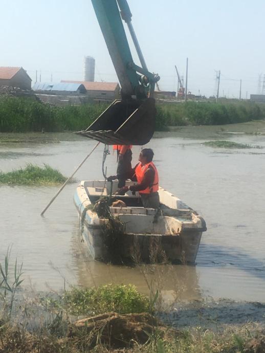 近日,機電服務(wù)公司租用長臂挖掘機清理西旺公司泵站河道的水草。又因河道中間水草面積較大,挖掘機不能完全清理,機電服務(wù)公司機電組王緒華等人,租用小船用繩子加鐵鉤等辦法,清理河道中的水草。(蘇南)