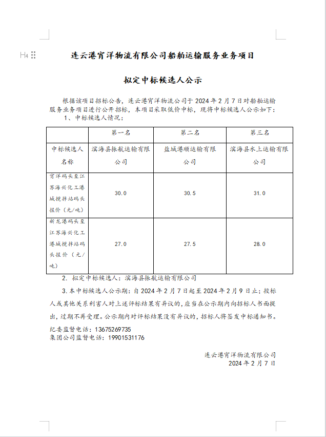 連云港宵洋物流有限公司船舶運(yùn)輸服務(wù)業(yè)務(wù)項目擬定中標(biāo)候選人公示