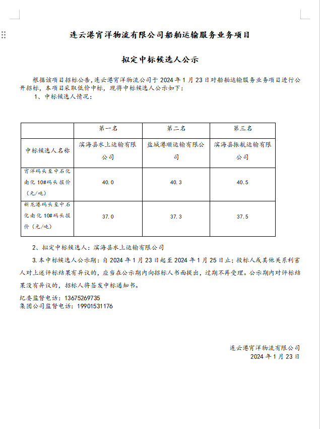 連云港宵洋物流有限公司船舶運輸服務(wù)業(yè)務(wù)項目擬定中標(biāo)候選人公示