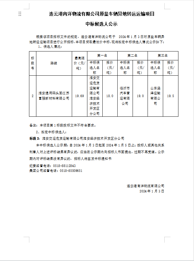 連云港宵洋物流有限公司原鹽車輛異地轉(zhuǎn)運運輸項目中標(biāo)候選人公示