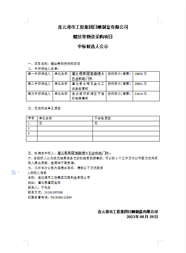 連云港市工投集團(tuán)日曬制鹽有限公司螺絲等物資采購項目中標(biāo)候選人公示
