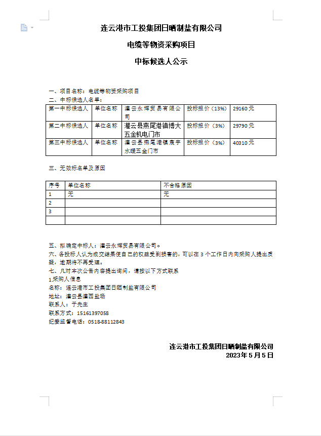 連云港市工投集團日曬制鹽有限公司電纜等物資采購項目中標(biāo)候選人公示