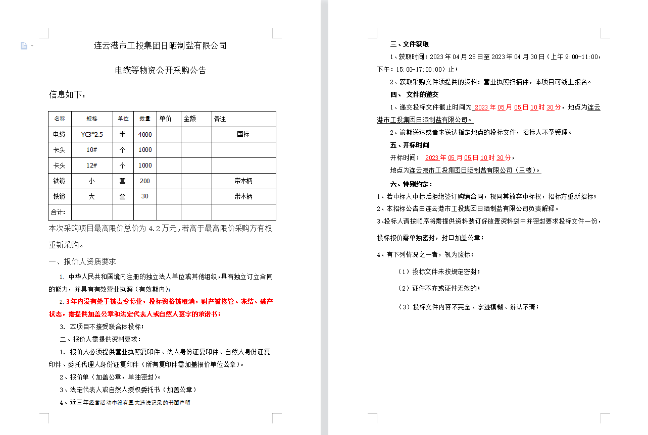 連云港市工投集團(tuán)日曬制鹽有限公司電纜等物資公開采購公告