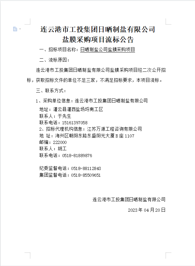 連云港市工投集團(tuán)日曬制鹽有限公司鹽膜采購項(xiàng)目流標(biāo)公告
