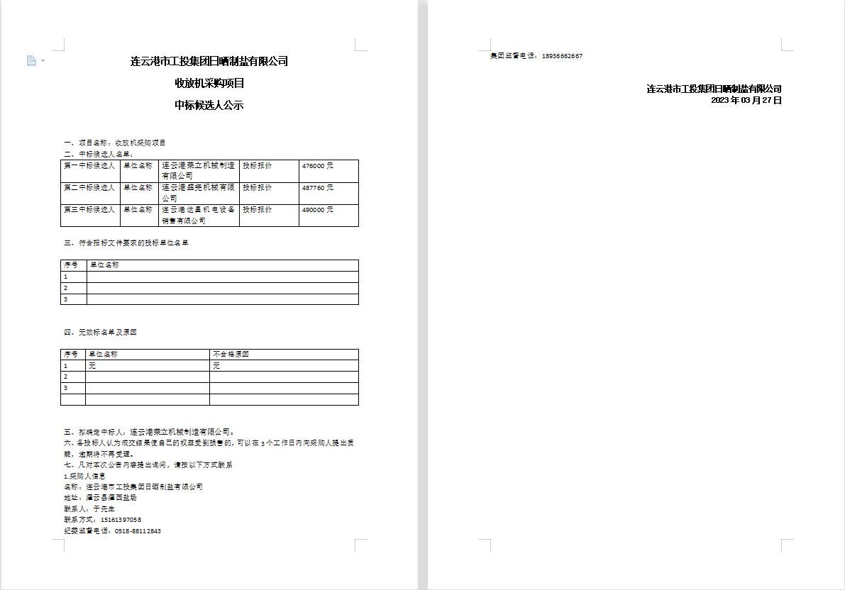 連云港市工投集團(tuán)日曬制鹽有限公司收放機(jī)采購項目中標(biāo)候選人公示