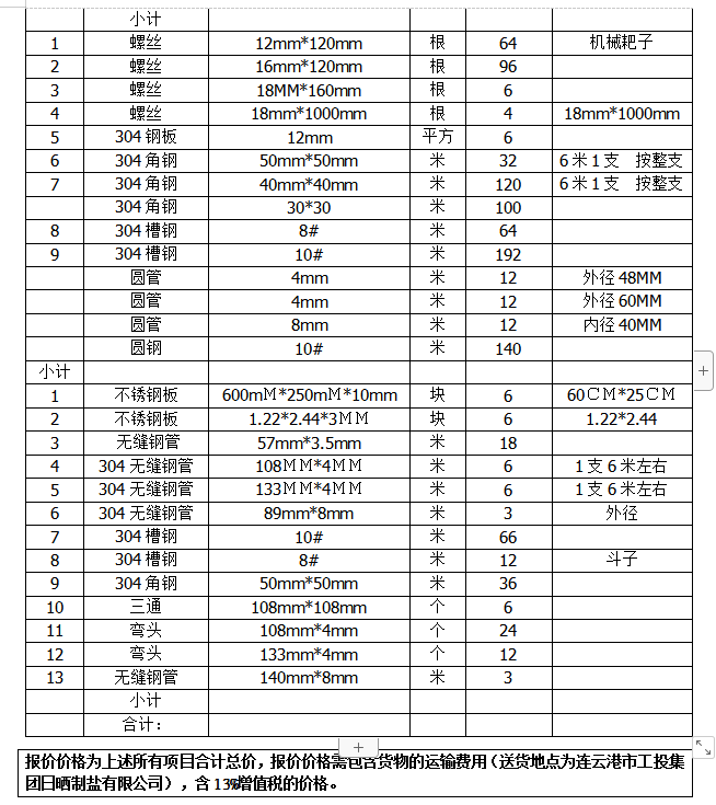 單價(jià)(含13%稅、運(yùn)輸費(fèi)用)。合同期間304不銹鋼單價(jià)不以304不銹鋼市場單價(jià)的變動而作任何調(diào)整。