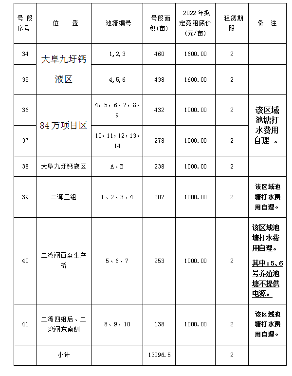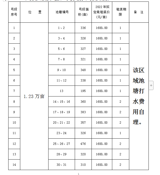 一、競(jìng)租池塘位置、號(hào)段劃分、競(jìng)租底價(jià)