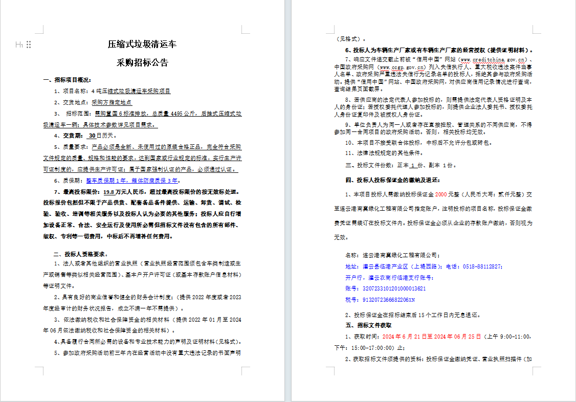 壓縮式垃圾清運(yùn)車采購招標(biāo)公告