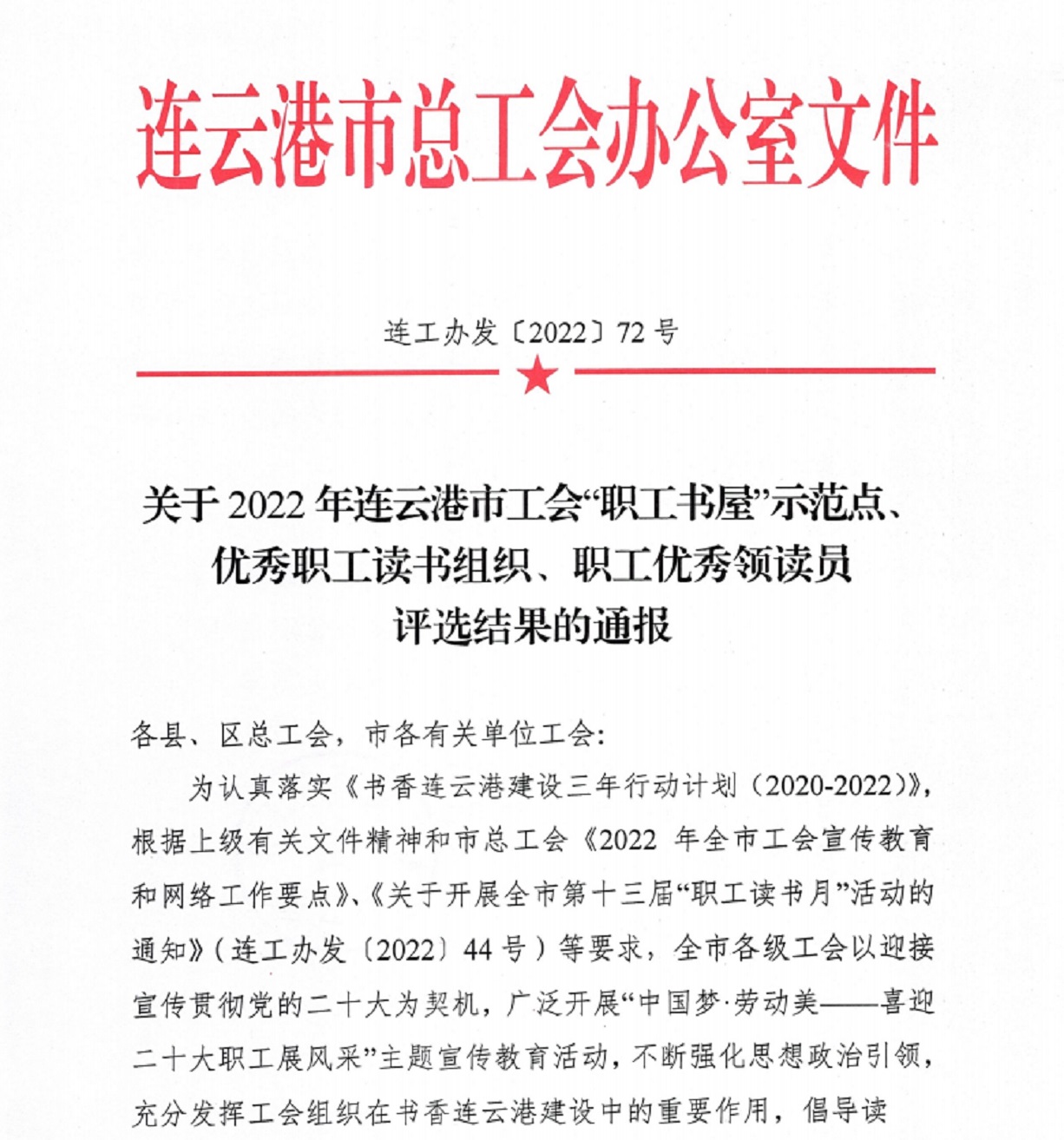 近日,工投金融板塊打造的“職工書屋”喜獲連云港市總工會授予“2022年連云港市工會職工書屋示范點”稱號。這是本年度全市45個示范點之一,也是金融板塊開展文化建設以來首次獲此殊榮。