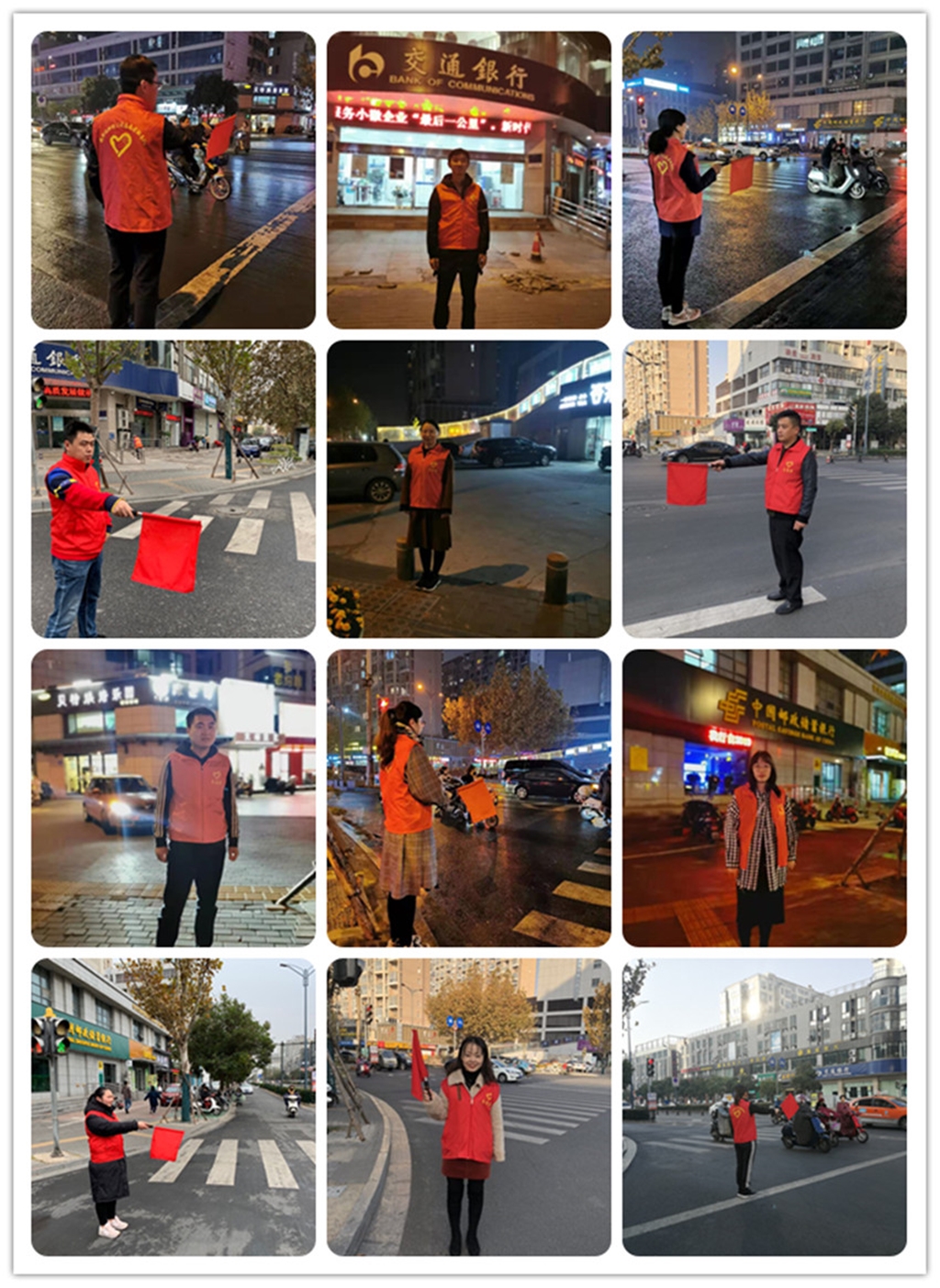 11月16日—11月17日,青年志愿者分四批次,分別于早上8:00—9:00和下午5:30—6:30準(zhǔn)時到達(dá)巨龍南路86號十字路口參加文明交通指揮活動。已過立冬,天氣特別寒冷,周末的清晨看不到交警的身影,只能看到幾名穿著紅馬甲的青年志愿者在寒風(fēng)中堅(jiān)定不移的拿著小紅旗站在斑馬線旁邊指揮行人安全過馬路。 下午5時30分,天色已漸漸的暗淡下來,但青年志愿者們并沒有缺席或早退,天空忽然下起了雨,穿著紅馬甲的青年志愿者在路燈的映襯下,與飄斜的細(xì)雨形成一道亮麗的風(fēng)景線。 本次志愿服務(wù)活動持續(xù)了兩天,青年志愿者們犧牲自己周末的休息時間,身體力行,通過參與“文明交通”志愿者服務(wù)活動,保證了服務(wù)片區(qū)的交通秩序,為港城創(chuàng)文創(chuàng)衛(wèi)工作貢獻(xiàn)一份力量。 (蔣禮巧) |