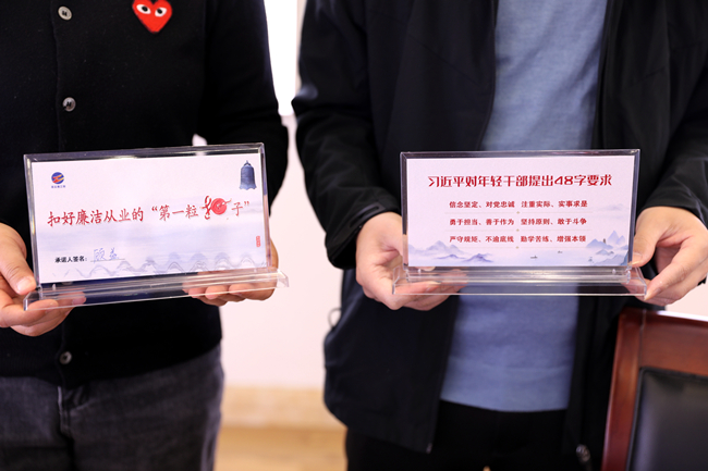 ? ? ? ?會后,公司紀(jì)委為10名新提拔干部發(fā)放了廉潔承諾桌牌,提醒他們常把“廉”字記心間,扣好廉潔從業(yè)的“第一??圩印?。(青紀(jì))