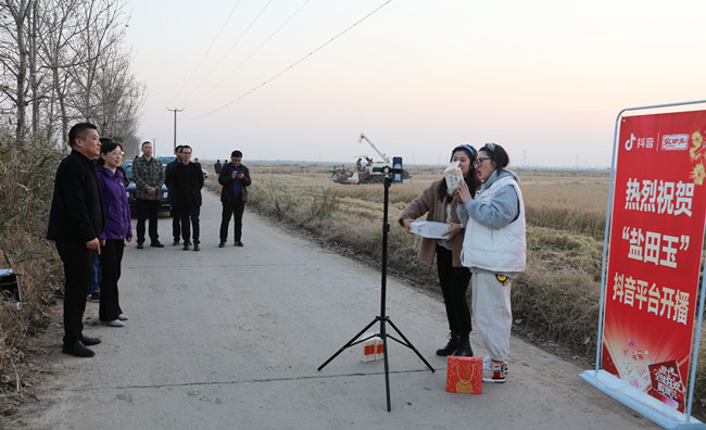 調(diào)研組先后參觀“鹽田玉”抖音帶貨直播間、“鹽田玉”生產(chǎn)加工車(chē)間、大新農(nóng)場(chǎng)水稻收割現(xiàn)場(chǎng)。