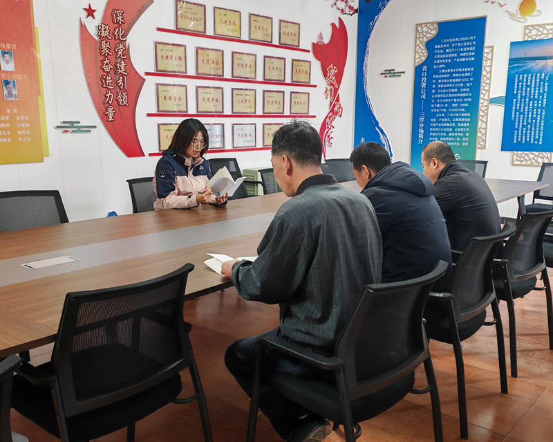 ? ? ? 4月30日下午,三洋分場黨支部組織全體在崗黨員原原本本學習《中國共產(chǎn)黨紀律處分條例》。自黨紀學習教育啟動以來,三洋分場黨支部不間斷組織黨員集中學習黨紀黨規(guī),推動黨員同志學紀、知紀、明紀、守紀,切實將思想和行動統(tǒng)一起來,為服務養(yǎng)殖生產(chǎn)和保障新能源項目推進凝聚力量。(三洋分場黨支部)